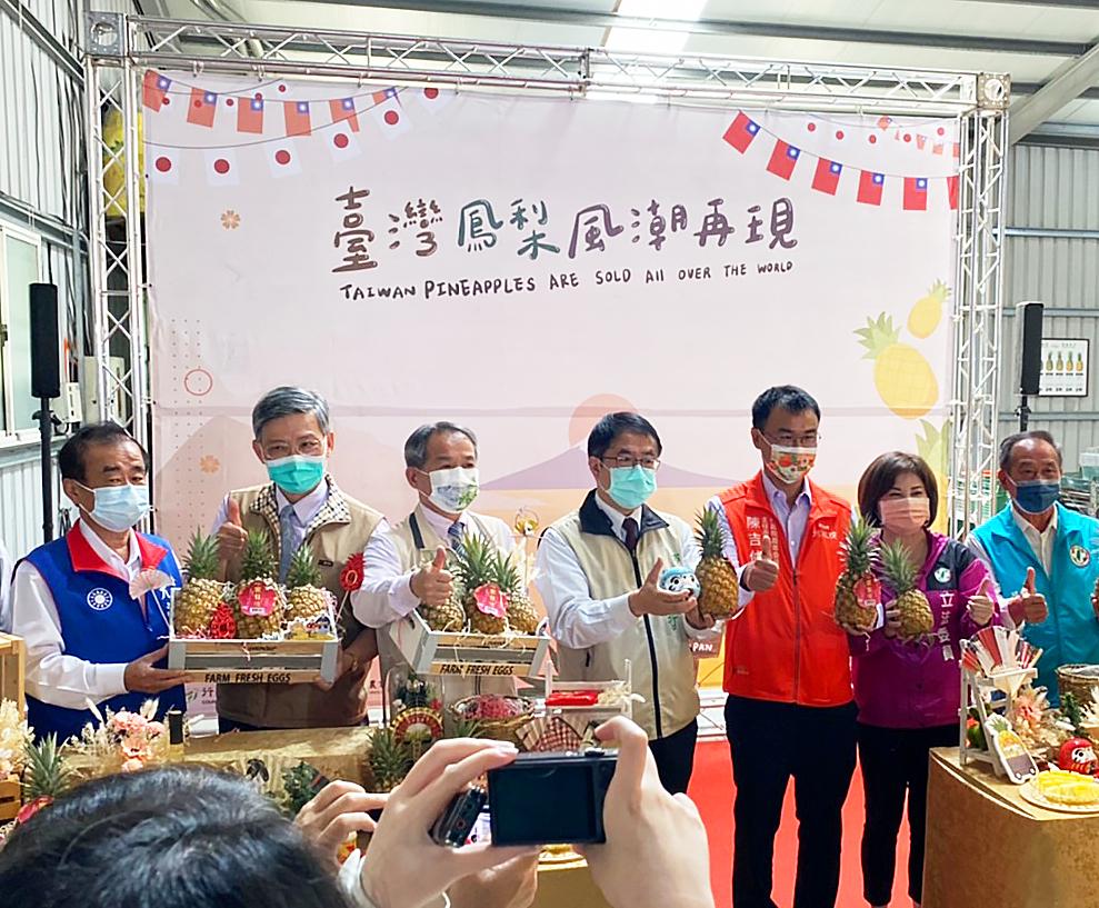 more台灣鳳梨海外銷售熱潮持續,4/6(三)於台南金子宏公司舉辦「台灣鳳梨 風潮再現」外銷日本記者會,農委會主委陳吉仲和台南市長黃偉哲親自到場祝賀,替相關從業人員加油打氣,給予支持肯定。