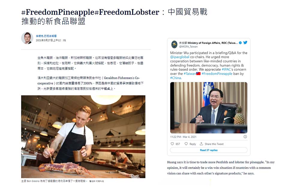 more台農發洪忠修董事長2021年3月接受外媒-「雪梨晨鋒報」採訪,表示 :「若中國不允許進口澳洲的葡萄酒與龍蝦,我們會吃它!」「限制越不合理,就越能將消費者聚集在一起。」
