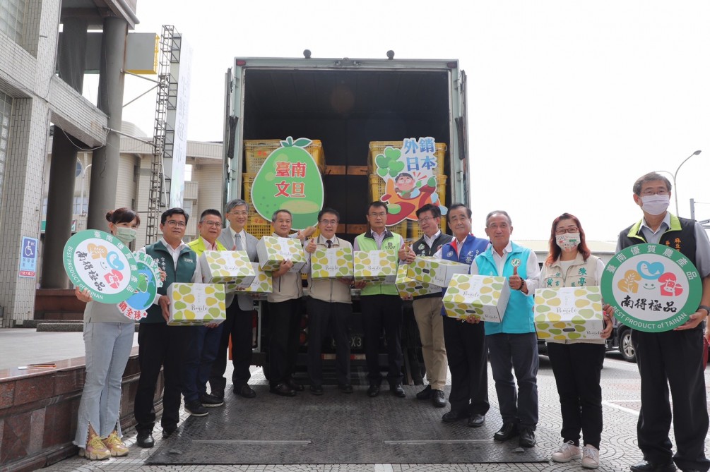 more香甜美味的台南文旦,2022首航外銷日本! 本公司與麻豆區農會於8月18日合辦"南得極品行銷全球-2022首航外銷日本"記者會。台南市長黃偉哲、農委會主委陳吉仲、立委郭國文、台灣蔬果輸出業同業公會理事長蘇雲嶢暨外銷業者皆出席見證本年首批銷往日本的台南文旦封櫃啟運。